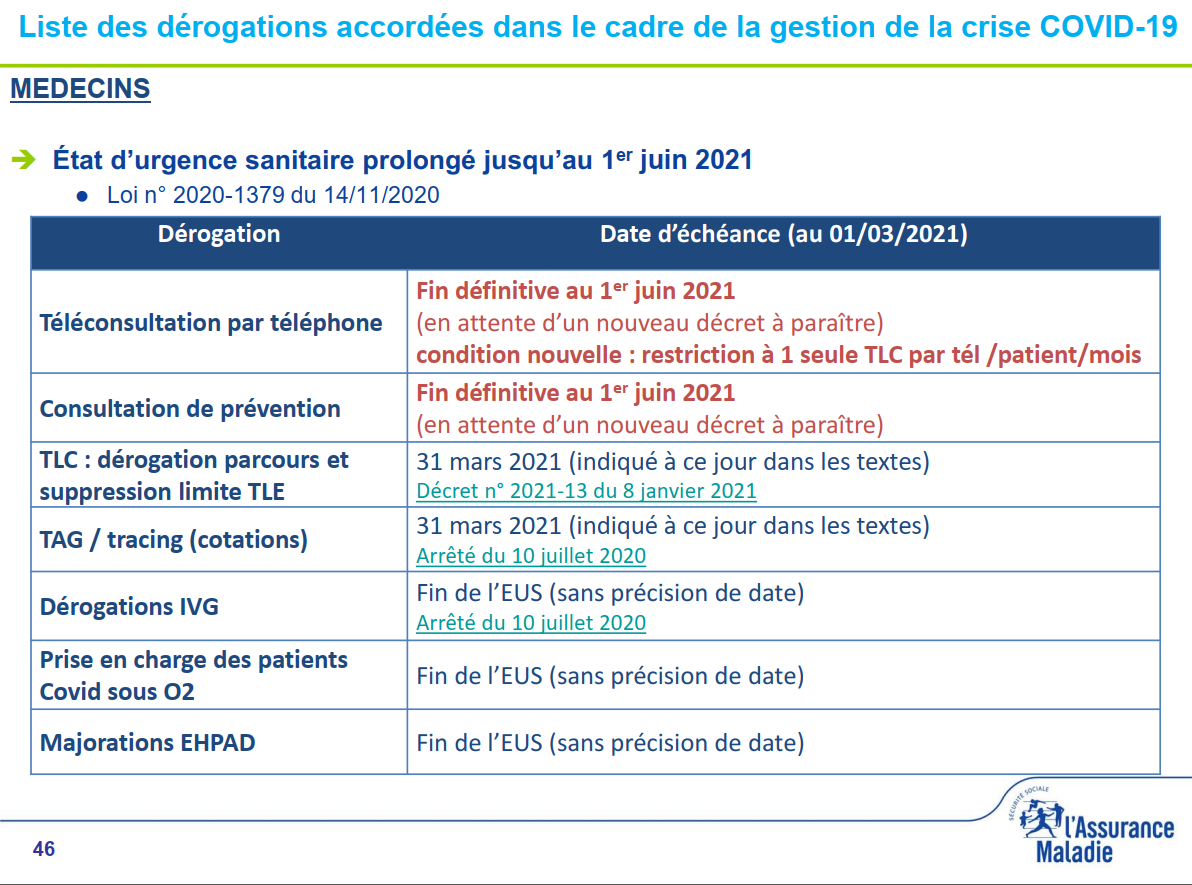 - Annexe : Liste des dérogations COVID arrêtées à fin février 2021
